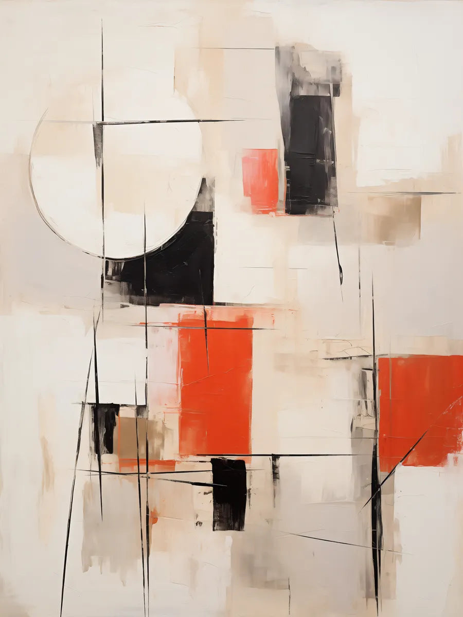 Dit unieke kunstwerk combineert een opvallend palet van zwart, wit, en levendig rood. De sterke contrasten en geometric vormen creëren een visuele impact die elke kamer transformeert. Dit is meer dan een kunstwerk; het is een statement piece dat perfect is voor moderne interieurs.
