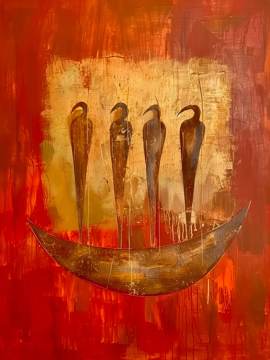 Dit meesterwerk toont een indrukwekkende voorstelling van vier vogels die elegant op een achtergrond van warme, aardse tinten staan. De combinatie van rijke kleuren en abstracte vormen creëert een dynamische uitstraling die elke ruimte kan transformeren.