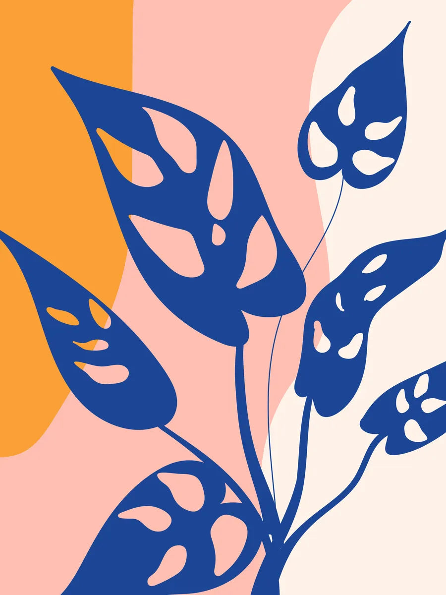 Deze kunstprint toont een betoverende compositie van bladeren in een levendig blauw, tegen een abstracte achtergrond van zachte perzik- en oranje tinten. De combinatie van kleuren geeft een frisse en dynamische uitstraling die elke ruimte verlevendigt en een gevoel van energie en creativiteit brengt.