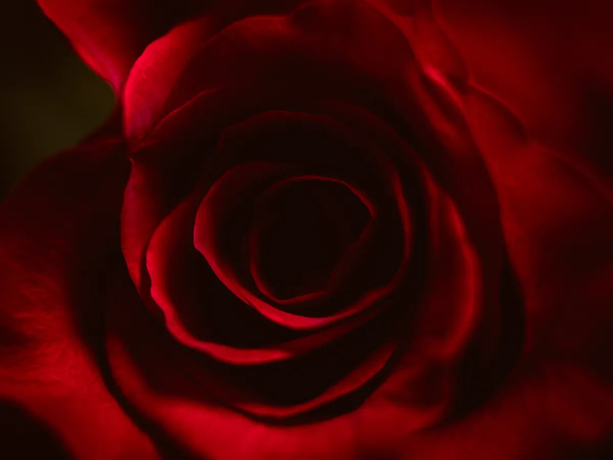 Deze prachtige close-up van een rode roos toont de fijne details van de bloemblaadjes en de rijke, diepe kleur. De subtiele schaduwen en het spel van licht accentueren de delicate textuur, waardoor het een adembenemende toevoeging is aan elke ruimte.