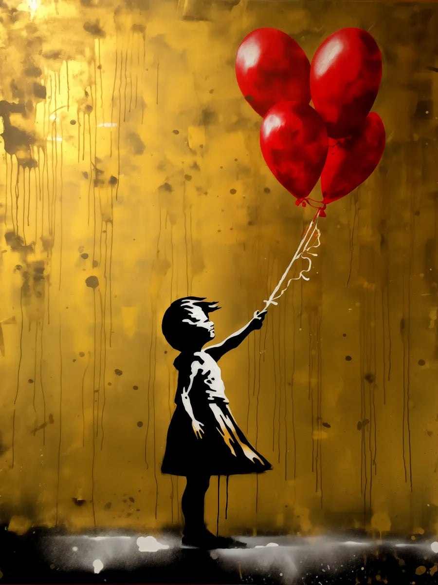 Dit betoverende kunstwerk toont een schattig meisje dat drie rode ballonnen omhoog houdt. De contrasterende kleuren en de stralende achtergrond creëren een krachtige boodschap van hoop en vrijheid. Perfect voor ruimtes waar je inspiratie wilt opwekken of een sprankje vreugde wilt toevoegen.