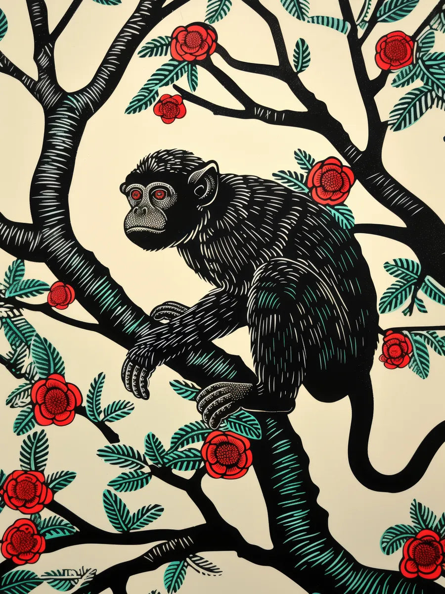 Deze unieke kunstprint toont een charmante aap zittend op een tak, omringd door kleurrijke rozen. De gedetailleerde lijnen en levendige kleuren brengen de speelse aard van de aap perfect tot leven. Dit kunstwerk voegt niet alleen karakter toe aan je interieur, maar roept ook een gevoel van avontuur en vrijgevochtenheid op.
