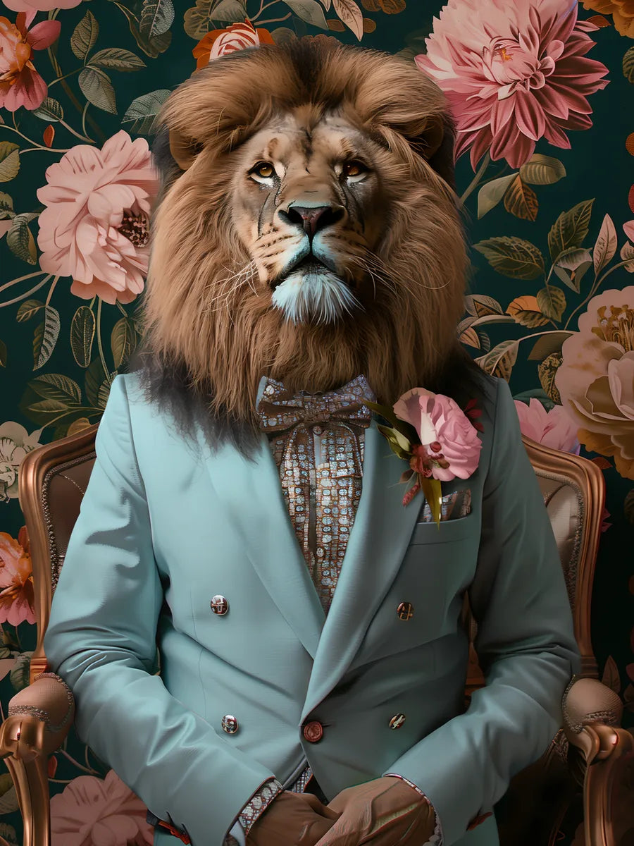 Dit opvallende kunstwerk toont een stijlvolle leeuw in een elegant kostuum, compleet met een bloemensprankel op zijn revers. De combinatie van het majestueuze dier en chique mode maakt dit stuk een waar statement. Dit kunstwerk is perfect voor iedereen die houdt van unieke en gedurfde inrichtingselementen.