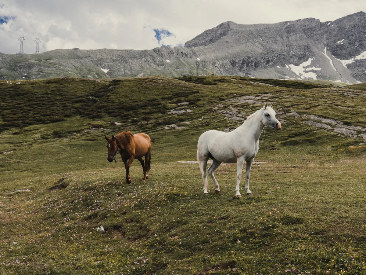 In dit schilderachtige landschap zie je twee prachtige paarden, één bruin en één wit, het gras verkennen op een Alpenweide. De imposante bergen op de achtergrond creëren een adembenemende setting die je doet verlangen naar de natuur. De serene uitstraling van de dieren en de omgeving brengt een gevoel van rust en vrijheid.