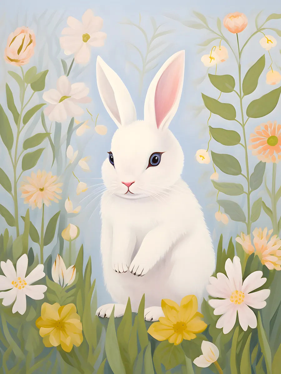 Dit prachtige kunstwerk toont een schattig wit konijn dat zich tussen een levendig bloemenveld bevindt. De combinatie van zachte kleuren en detaillistische bloemen maakt dit stuk tot een geweldige toevoeging aan elke ruimte. Dit blijvende beeld roept gevoelens van vreugde en natuur op, perfect voor liefhebbers van dieren en bloemen.