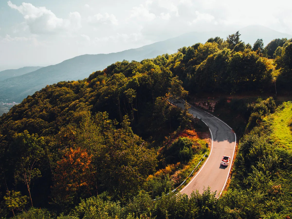 Geniet van de schitterende panorama's die deze afbeelding van een bergweg in de natuur biedt. De kronkelige weg slingert elegant door het groene berglandschap, omringd door weelderige bomen en een helderblauwe lucht. Deze kunstwerk roept een gevoel van avontuur en ontsnapping naar de natuur op.