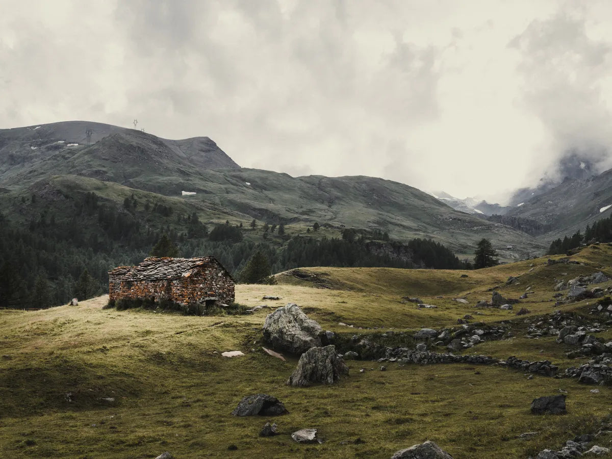 Dit schilderij toont een prachtig berglandschap, waar de natuur zijn mooiste kleuren laat zien. Het huisje, omringd door weidse velden en majestueuze bergen, straalt een gevoel van rust en verwevenheid met de natuur uit. Dit kunstwerk brengt de schoonheid van de buitenwereld naar binnen, waardoor je elke dag kunt genieten van deze adembenemende aanblik.