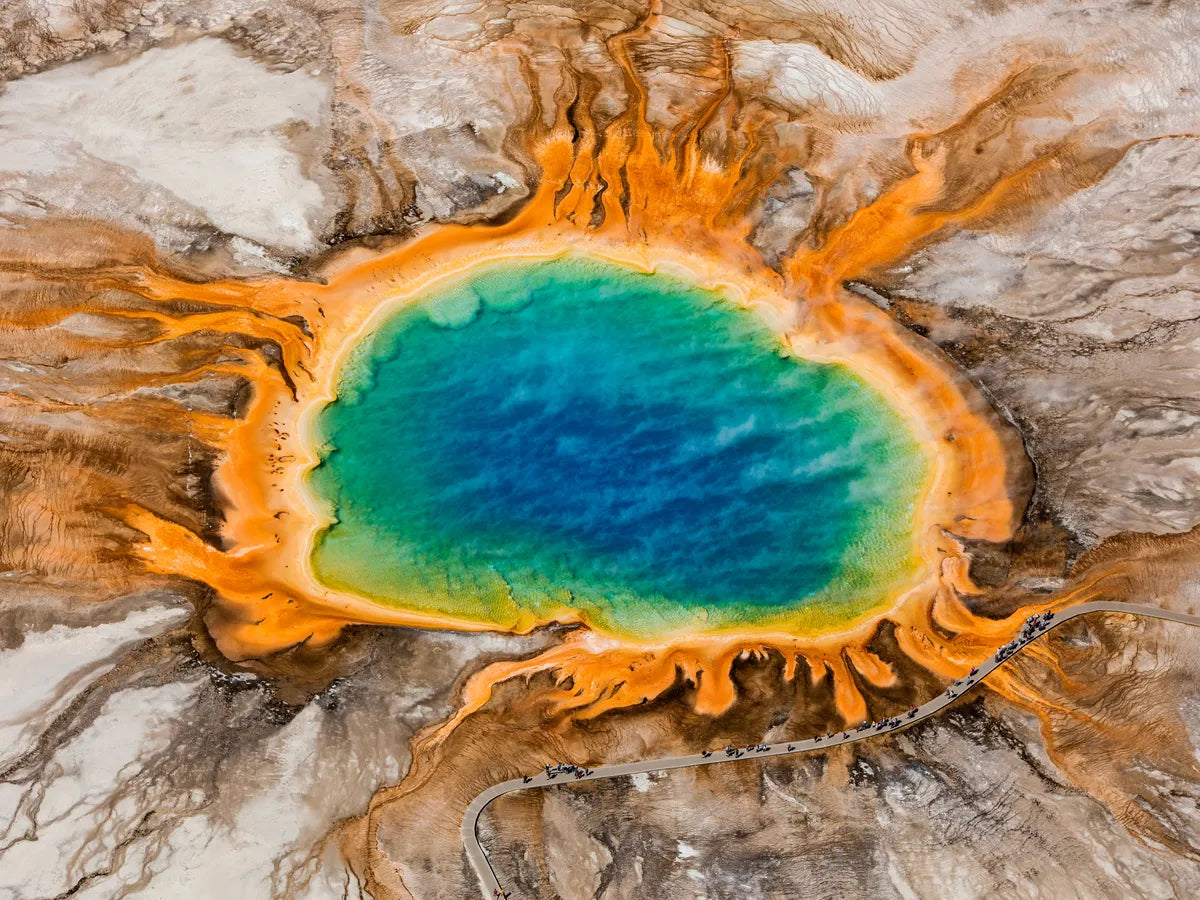Deze unieke afbeelding toont de spectaculaire Grand Prismatic Spring in Yellowstone, met zijn levendige kleurschakeringen van blauw, groen en oranje. De combinatie van mineralen en micro-organismen creëren een visueel spektakel, perfect om elke ruimte een natuurlijke schoonheid te geven.