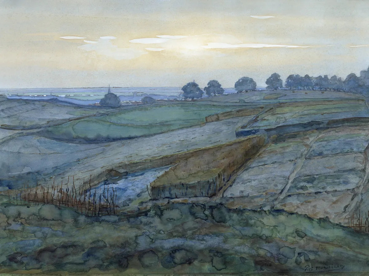 Dit adembenemende kunstwerk vangt de sereniteit van de natuur met zijn zachte, aquarellen in aardetinten. De uitgestrekte akkers worden omarmd door een rustige lucht, waardoor je meteen wordt meegenomen naar een vredige plek waar de tijd lijkt stil te staan. Perfect voor wie houdt van de schoonheid van het platteland.