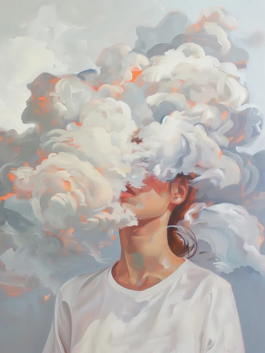 Dit kunstwerk is een bijzondere weergave van een vrouw die omhuld is door zachte wolken. De combinatie van abstracte elementen en realistische details creëert een dromerige sfeer die prikkelt en inspireert. Perfect voor liefhebbers van moderne kunst die verbinding zoeken met hun emoties.