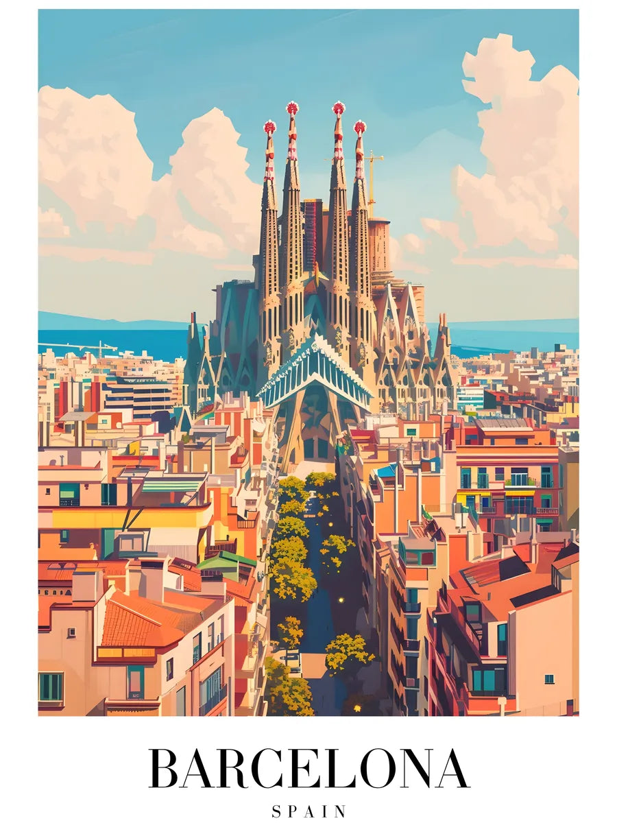 Dit kunstwerk biedt een prachtig panorama van de iconische stad Barcelona, met de indrukwekkende Sagrada Familia als stralend middelpunt. De felgekleurde gebouwen en de blauwe lucht creëren een levendige en uitnodigende sfeer die elke ruimte opfleurt. Dit is een feest voor het oog en brengt de unieke energie van Barcelona naar jouw interieur.
