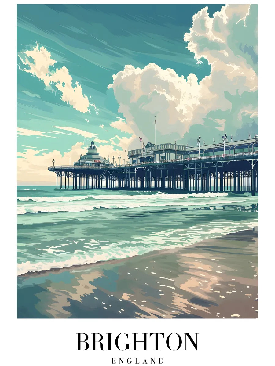 Dit kunstwerk brengt je naar de iconische pier van Brighton, waar het verfrissende zeewater en de majestueuze wolken samenkomen. De gedetailleerde weergave van de pier en het heldere blauw van de lucht bieden een gevoel van vrijheid en avontuur.