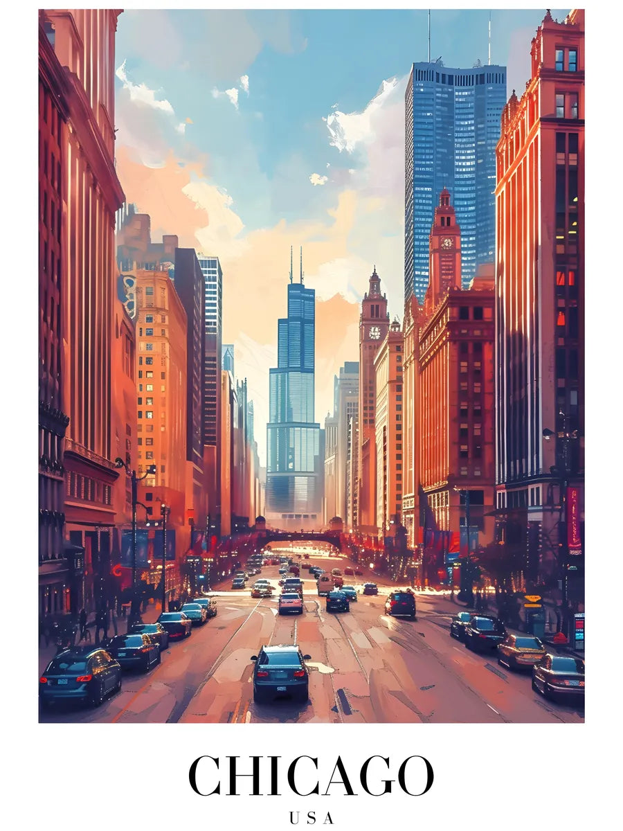 Dit kunstwerk biedt een spectaculair uitzicht op het bruisende stadsleven van Chicago tijdens de schemering. De hoge wolkenkrabbers weerspiegelen de warme kleuren van de ondergang, wat zorgt voor een betoverende en magische sfeer. Elk detail in de afbeelding vangt de essentie van deze iconische stad, waardoor het een must-have is voor iedere fijnproever van stedelijke kunst.