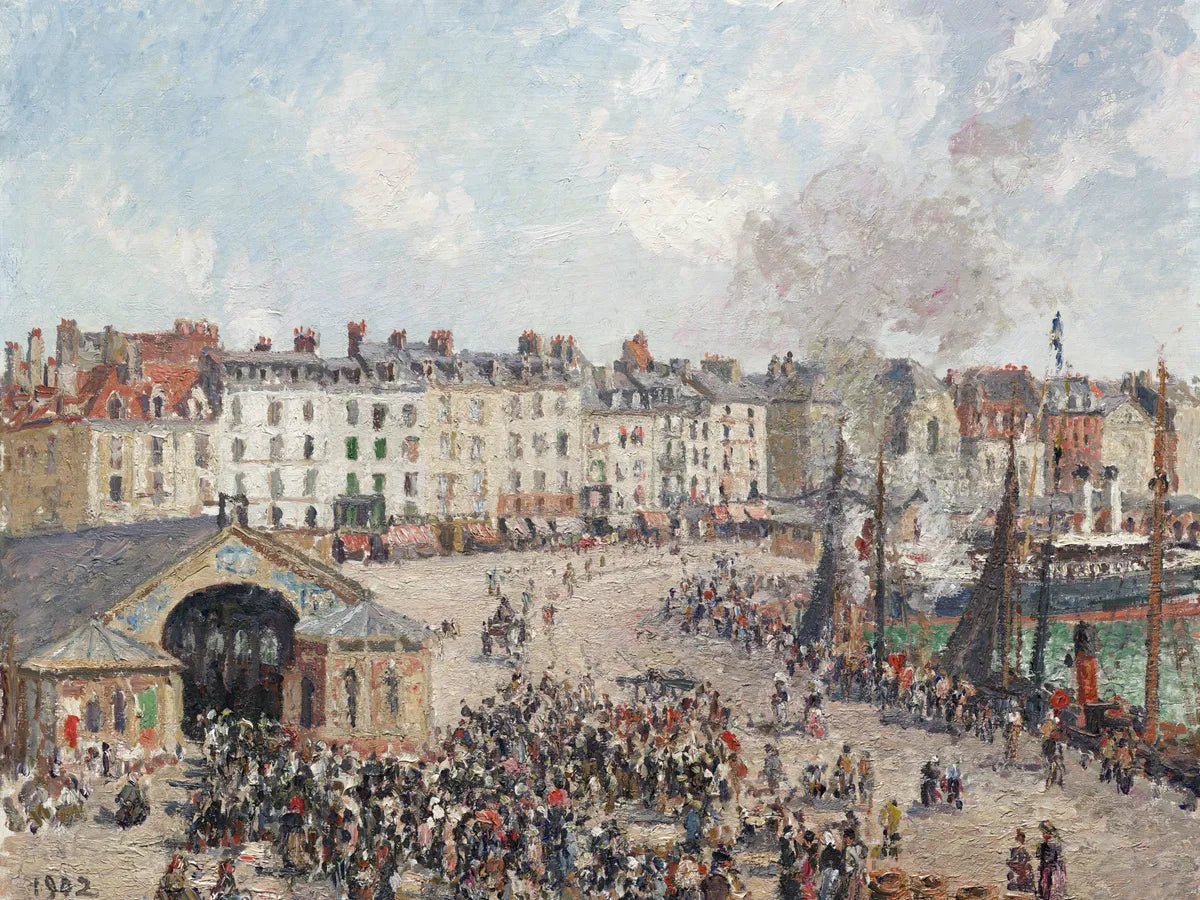 Dit schitterende kunstwerk brengt de levendigheid van een historische haven tot leven. De afbeelding toont een drukke pier vol bezoekers, stoomschepen die hun lading lossen en bedrijvige handelaren die de zaken afhandelen. De kleuren en penseelstreken laten de dynamiek en energie van het havenleven perfect zien, waardoor het bijna lijkt alsof je zelf aanwezig bent in die tijd.