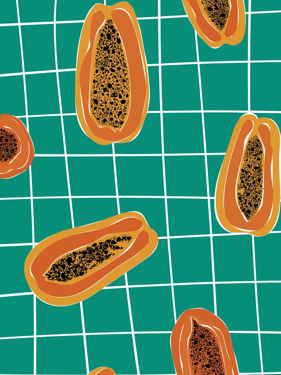 Deze levendige illustratie van papaja's op een frisse groene achtergrond brengt een speelse en tropische sfeer in elke ruimte. De opvallende kleuren en unieke vormen zorgen ervoor dat deze print een echte blikvanger is, perfect voor liefhebbers van kleurrijke kunst en fruitige ontwerpen. Het ontwerp combineert creativiteit met een gevoel van gezelligheid, wanneer je het aan je muur hangt.