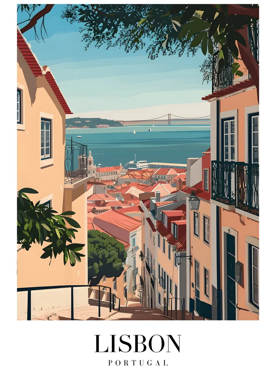 Dit kunstwerk vangt de essentie van Lissabon met zijn charmante straatjes, kleurrijke huizen en het serene uitzicht op de zee. De warme tinten geven dit stuk een levendige energie, perfect voor elke ruimte die behoefte heeft aan een vleugje cultuur en kleur. Dit is meer dan een afbeelding; het is een venster naar de schoonheid van een van Europa's meest geliefde steden.