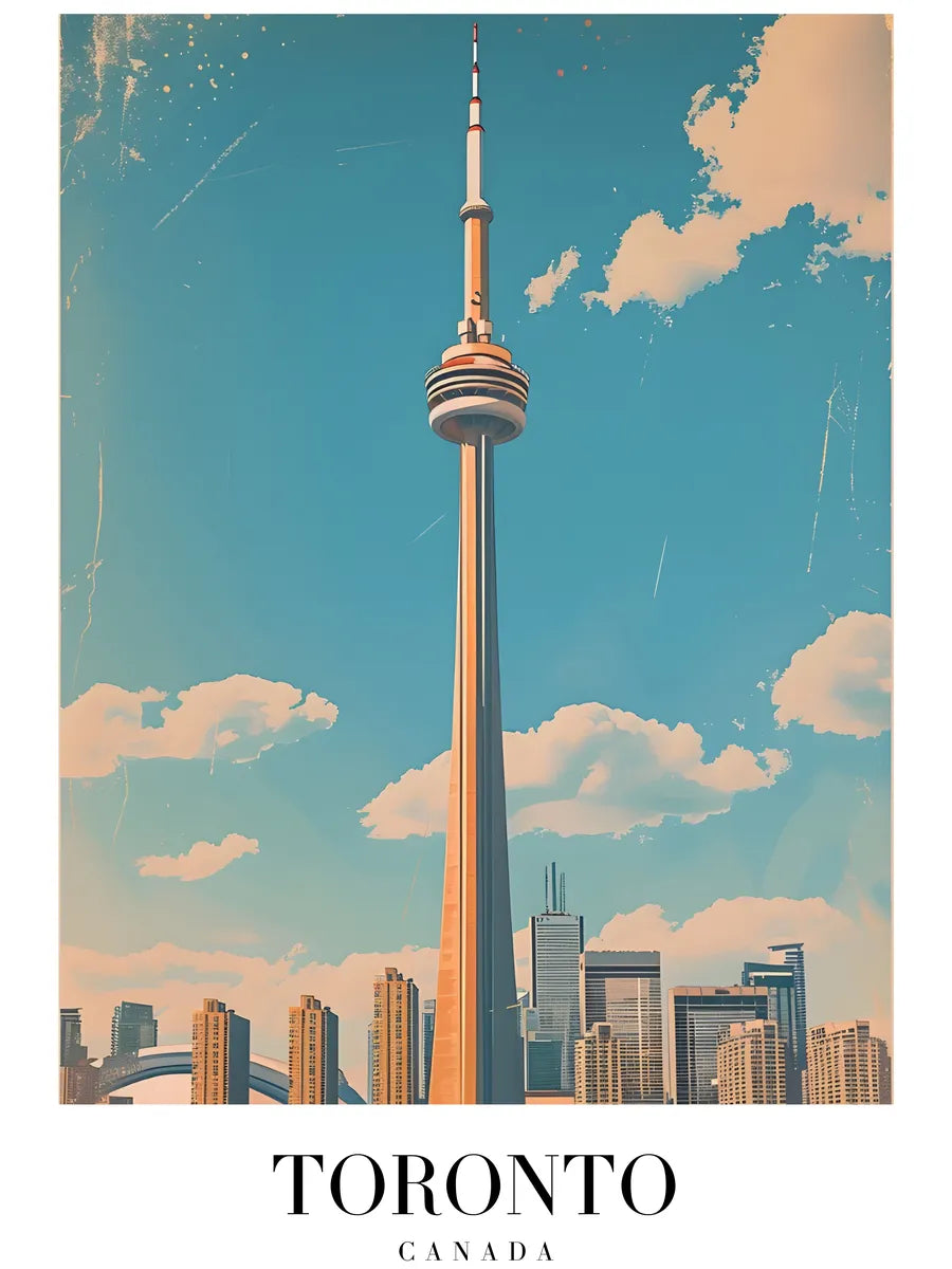 Deze kunstprint toont de indrukwekkende skyline van Toronto, met de iconische CN Tower die trots boven de stad uittorent. De vrolijke kleuren en luchtige compositie creëren een gevoel van vrijheid en avontuur, waardoor deze print perfect is voor liefhebbers van stedelijke kunst en cultuur.
