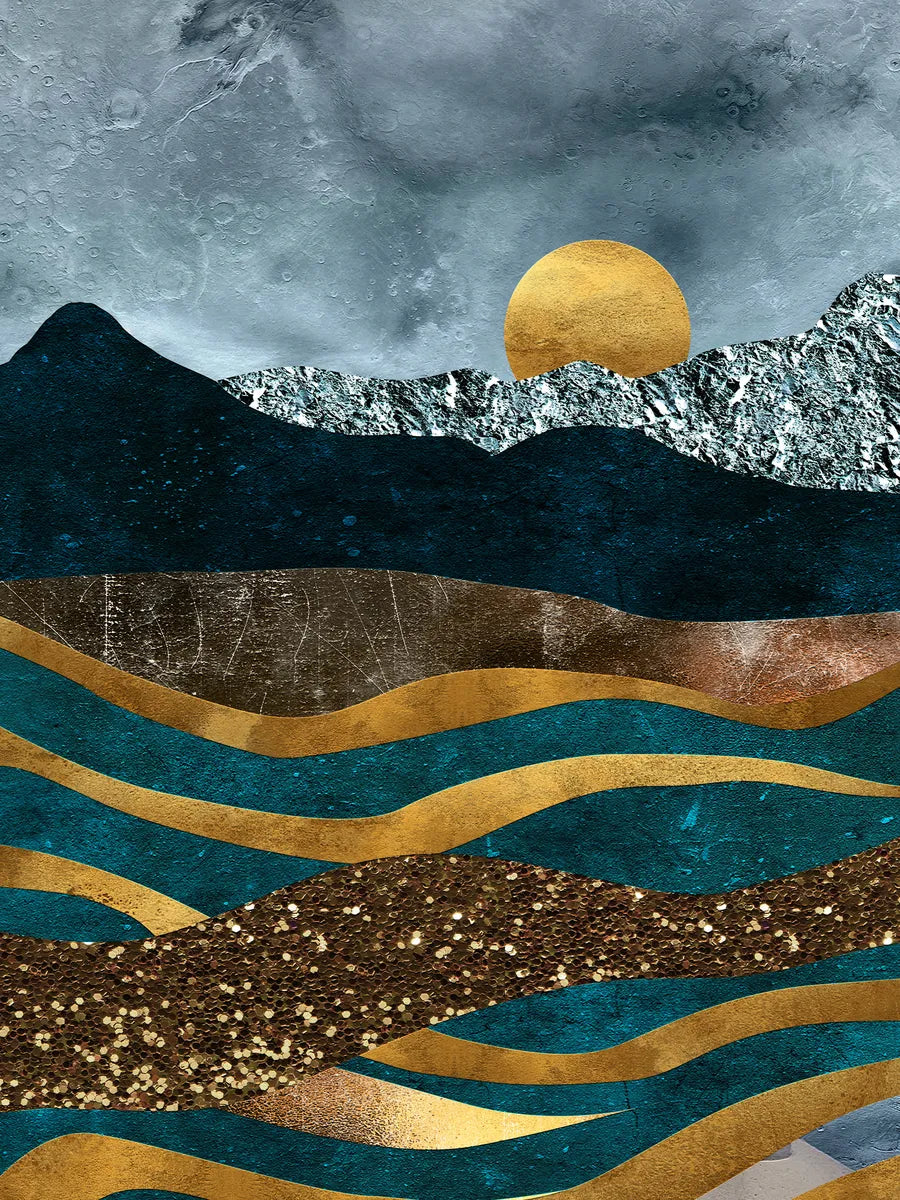 Dit prachtige kunstwerk toont een serene weergave van een berglandschap onder een schitterende, gouden zon. De combinatie van de kalme, golvende lijnen en diepe kleurcontrasten creëren een gevoel van rust en verbondenheid met de natuur. Dit stuk ademt een vredige uitstraling, waardoor het ideaal is voor ontspanningsruimtes.